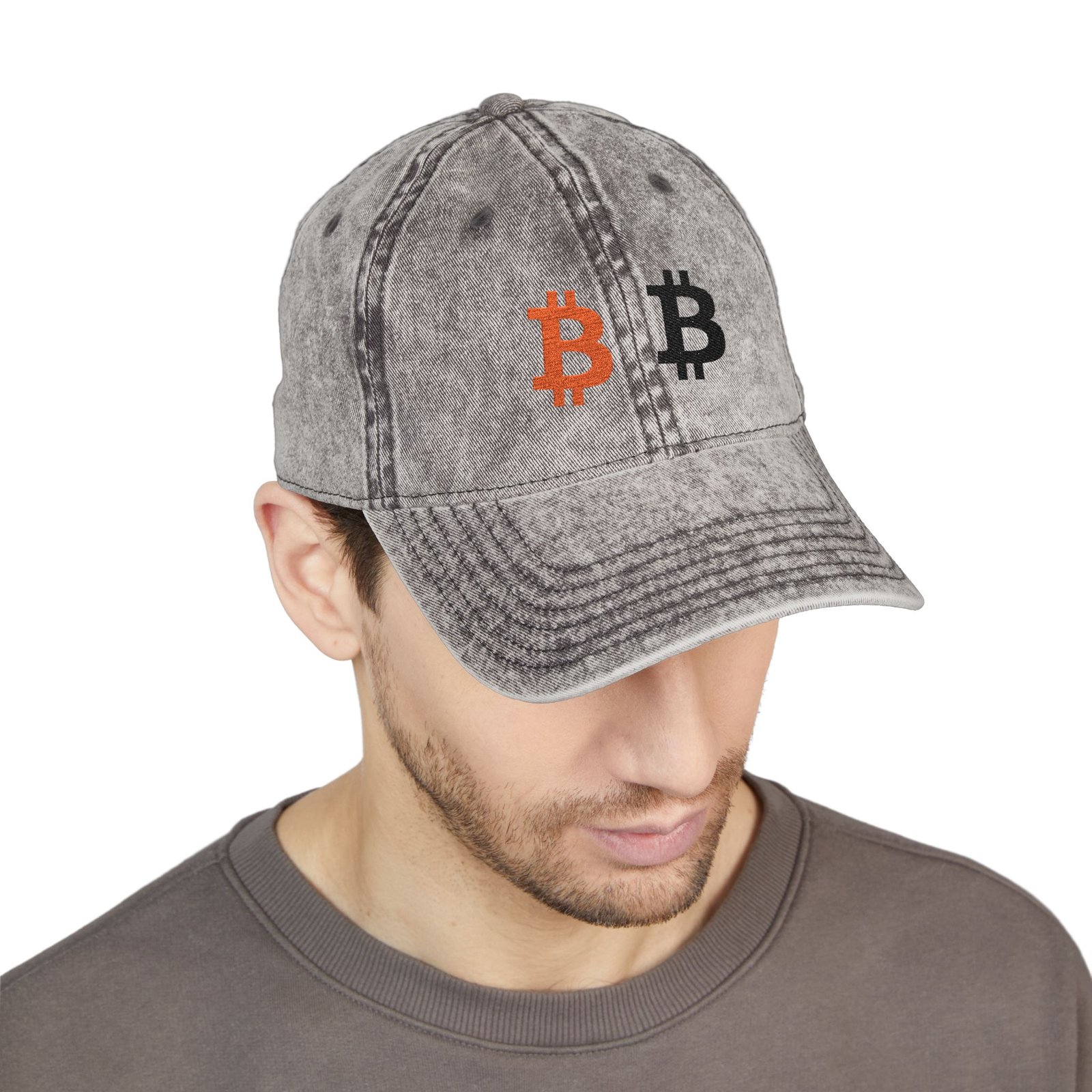 – Dual Bitcoin embroidery: black and pixelated-gold accent on the front